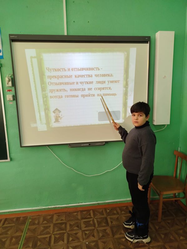 15 января у обучающихся начальных классов прошло очередное занятие в рамках регионального проекта курса «Добротолюбие». В 3Б классе прошло занятие на тему «Чуткость». На уроке обучающиеся не просто обсудили важные человеческие качества, но и почувствовали их на практике. Ребята анализировали различные ситуации. Читали по очереди задания на карточках и рассуждали, как можно проявить чуткость в каждой ситуации. Дети читали и обсуждали рассказ «Глухая девочка». В ходе обсуждения рассказа поняли, что очень важно не проходить мимо чужой беды, быть внимательным к окружающим, замечать их потребности и не оставаться равнодушным. Обсуждение рассказа вызвало живые отклики ребят, многие рассказали свои личные истории. Посмотрели и обсудили мультфильм «Подарок для самого маленького». Дети сделали выводы, что даже маленький поступок может стать проявлением настоящей чуткости. Во время занятия дети поиграли в игру «Тёплое сердечко», вспомнили ласковые слова, которыми их называют дома и записали эти слова на «лучиках» нарисованного на доске солнца. Это создало тёплую эмоциональную атмосферу и подчеркнуло ценность заботливых отношений. В конце урока дети создали «Дерево чуткости». На листочках они написали примеры чуткого поведения и приклеили их на макет дерева.